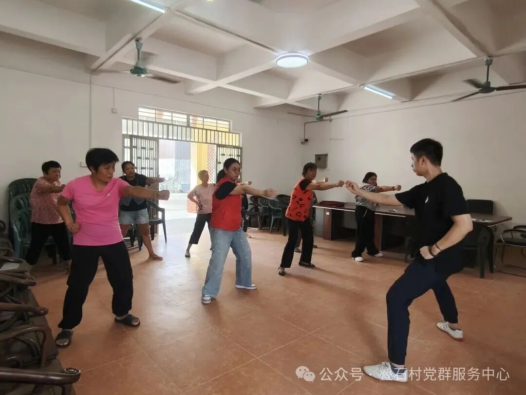 在随后的教学环节中,教练一招一式地分解动作,耐心指导。村民们学习热情高涨,跟着教练的口令,认真地舒展身体,起势、抬手、出拳……动作逐渐变得流畅自然。叠石乐园内,大家动作整齐划一,形成了一道活力健康的风景线。