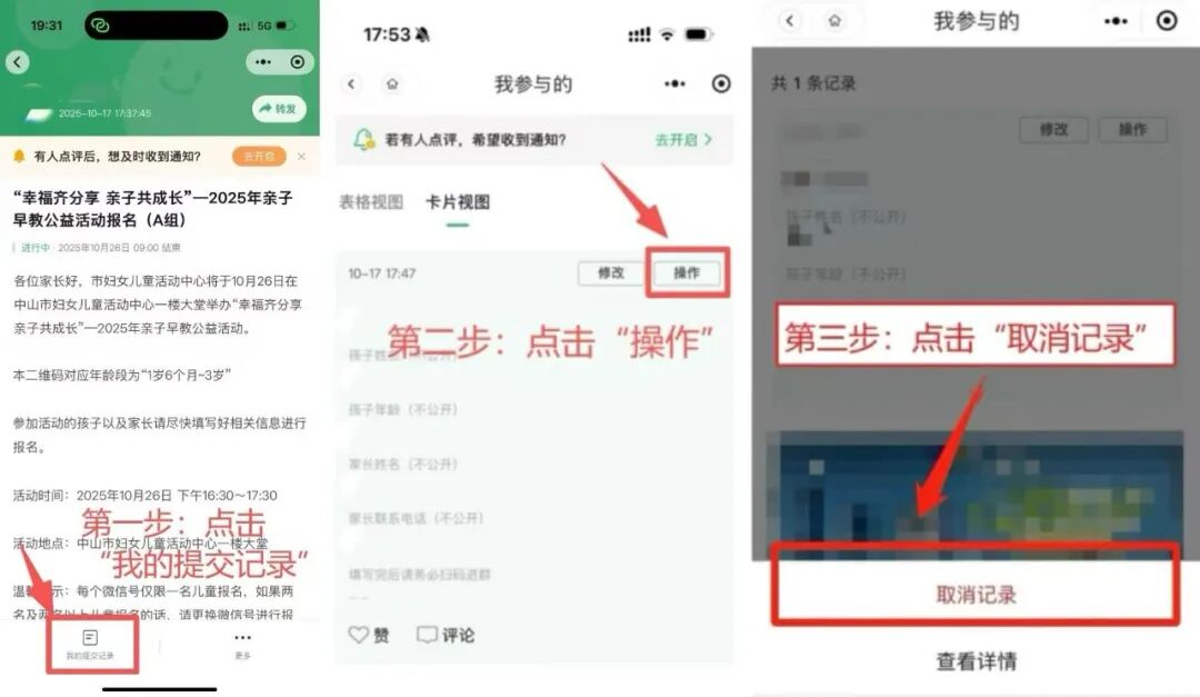 1、报名后如临时有事无法参加,请于25日23:59前自行取消。取消步骤方法如下:点击“我的提交记录”→“操作”→“取消记录”。