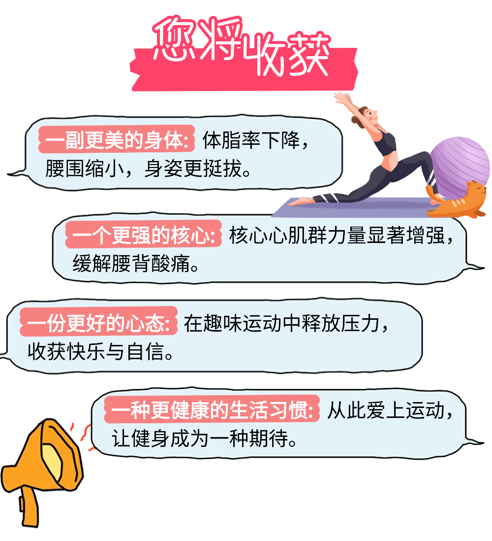 借助瑜伽大球,巧妙融合有氧、力量与平衡训练,让你在坐、卧、弹、动之间,完成一系列趣味盎然的全身性动作,深度激活全身每一处肌群,在欢快中,轻松甩掉脂肪,雕刻身体线条,让运动变得有趣且上瘾!是一种集趣味,高效且不伤膝盖的燃脂方式。