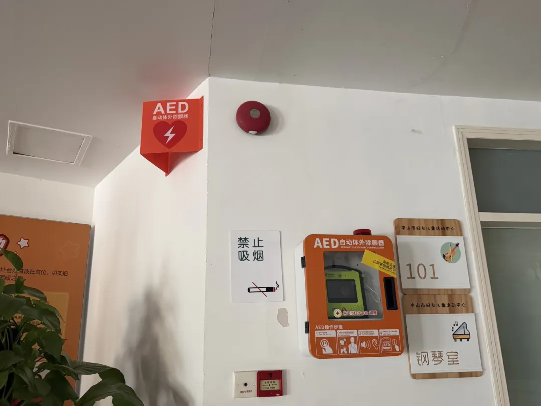 位于一楼大厅的“应急救护站”,是我们的健康守护站。这里不仅有专业的急救志愿者值守,还配备了完善的医疗物资和“救命神器”——AED(自动体外除颤仪)。我们二楼的工作台也有专业的医护人员值守,任何突发的身体不适,都能在这里得到及时、专业的帮助。