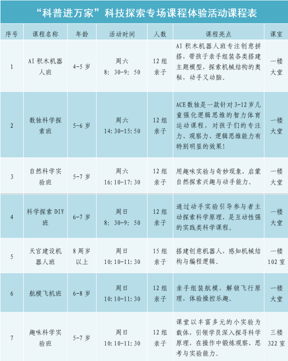 为深入学习贯彻《中华人民共和国科学技术普及法》及《全民科学素质行动规划纲要(2021-2035年)》精神,充分发挥校外教育阵地的科普服务功能,面向全市家庭普及前沿科技知识、激发青少年科学探索热情,助力全民科学素质提升,中心特举办“科普进万家”科技探索专场课程体验活动。