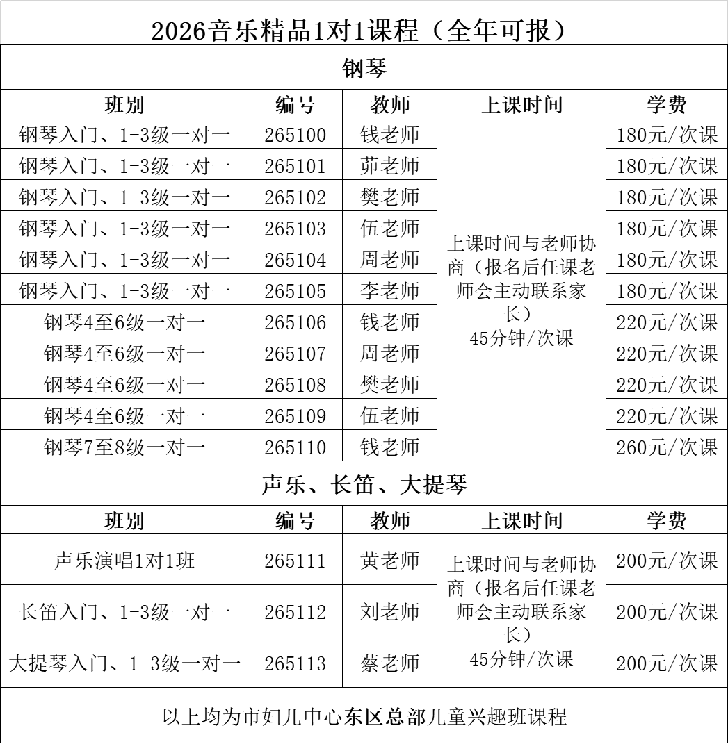 2026中心精品音乐1对1课程表